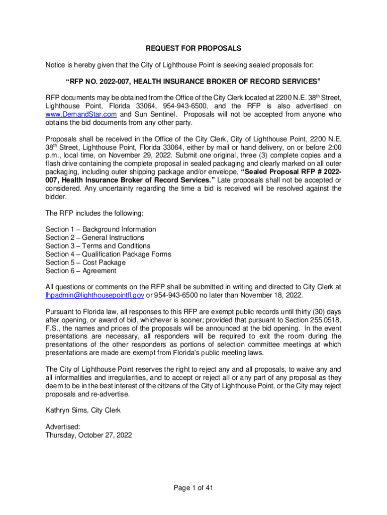 REQUEST FOR PROPOSALS Notice is hereby given that the City of Lighthouse Point is seeking sealed proposals for: RFP NO. 2022007, HEALTH INSURANCE BROKER OF RECORD SERVICES RFP documents may be obtained
