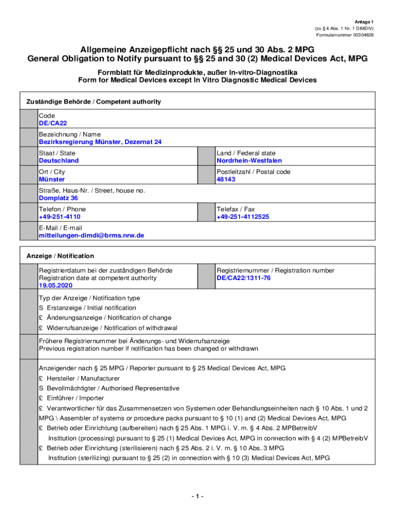 Engage 1 (EU 4 Abs. 1 NR. 1 DIM DIV) Formularnummer 00304828Allgemeine Anzeigepflicht each 25 UND 30 Abs. 2 MPG General Obligation to Notify pursuant to 25 and 30 (2) Medical Devices Act, MPG Formulate