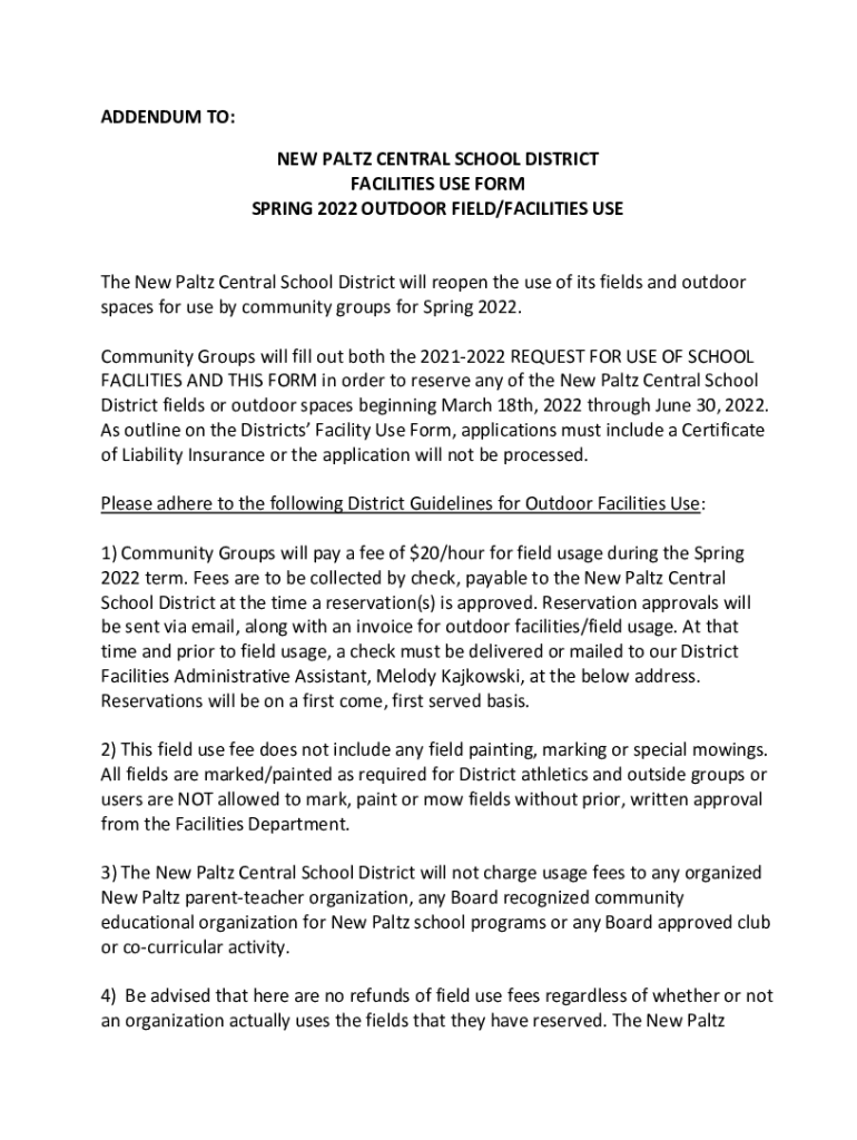 ADDENDUM TO: NEW WALTZ CENTRAL SCHOOL DISTRICT FACILITIES USE FORM SPRING 2022 OUTDOOR FIELD/FACILITIES Seth New Waltz Central School District will reopen the use of its fields and outdoor spaces