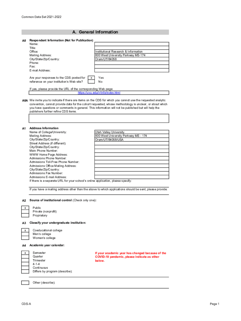 Common Data Set 20212022A. General Information A0Respondent Information (Not for Publication) Name: Title: Office: Institutional Research & Information Mailing Address: 800 West University Parkway