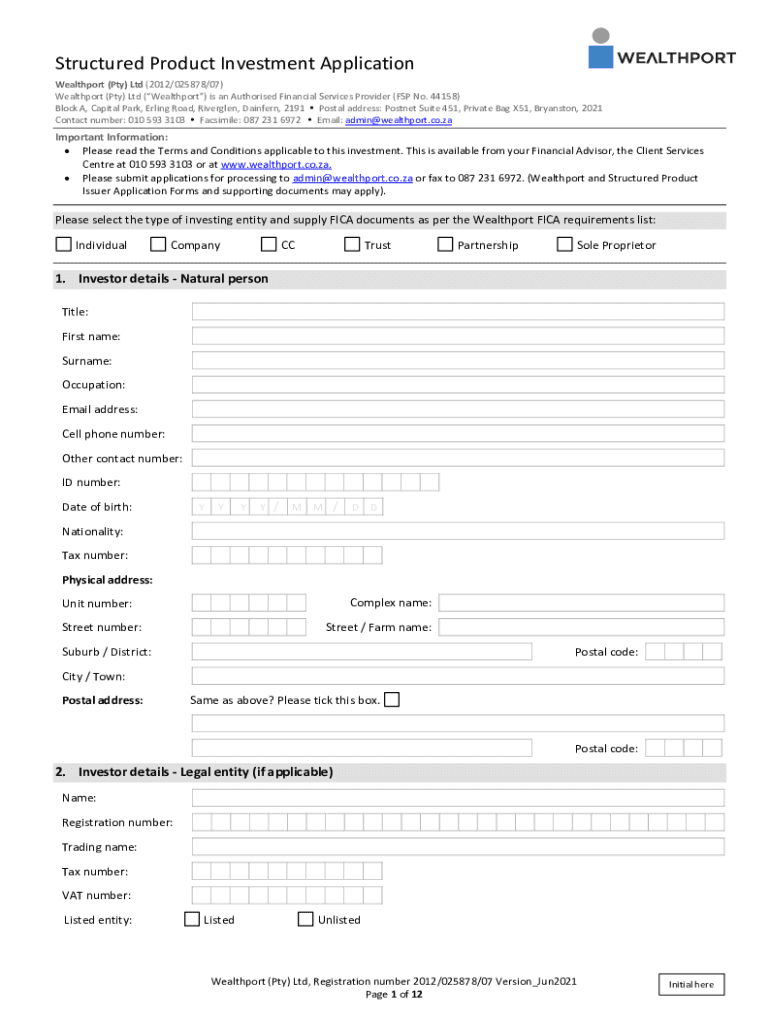 Structured Product Investment Application Wealth port (Pty) Ltd (2012/025878/07) Wealth port (Pty) Ltd (Wealth port) is an Authorized Financial Services Provider (FSP No. 44158) Block A, Capital Park,