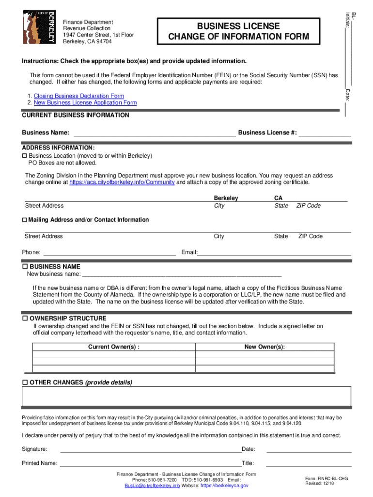 BUSINESS LICENSE CHANGE OF INFORMATION FORMInstructions: Check the appropriate box(BS) and provide updated information. This form cannot be used if the Federal Employer Identification Number (VEIN)