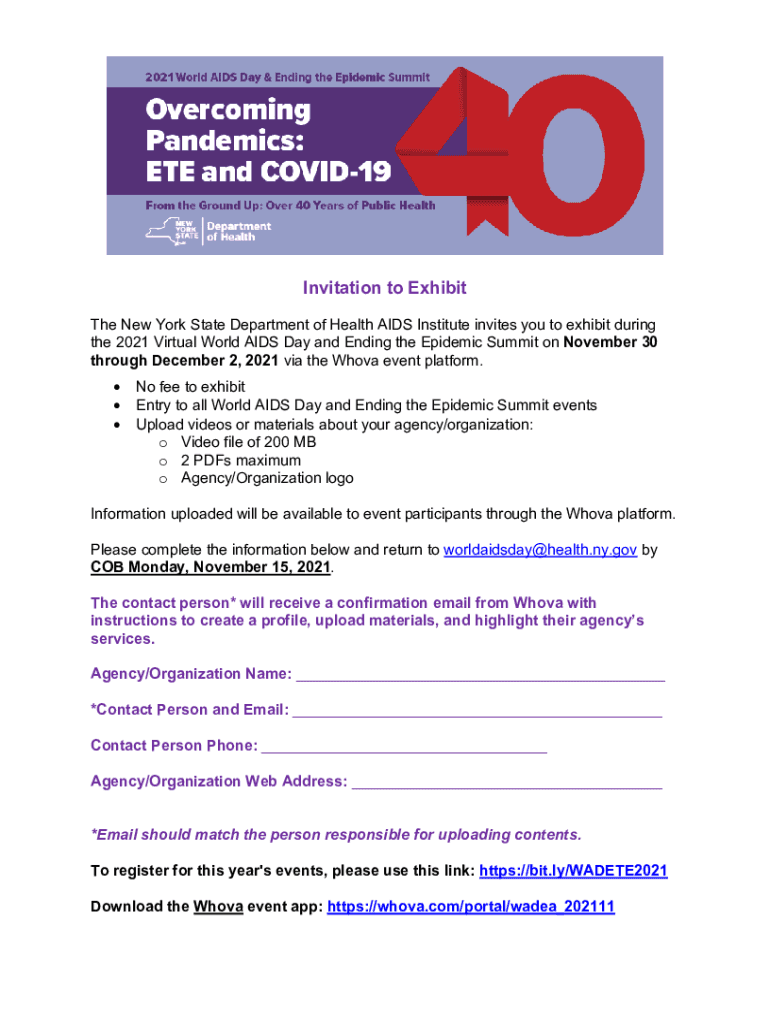 Invitation to Exhibit The New York State Department of Health AIDS Institute invites you to exhibit during the 2021 Virtual World AIDS Day and Ending the Epidemic Summit on November 30 through December