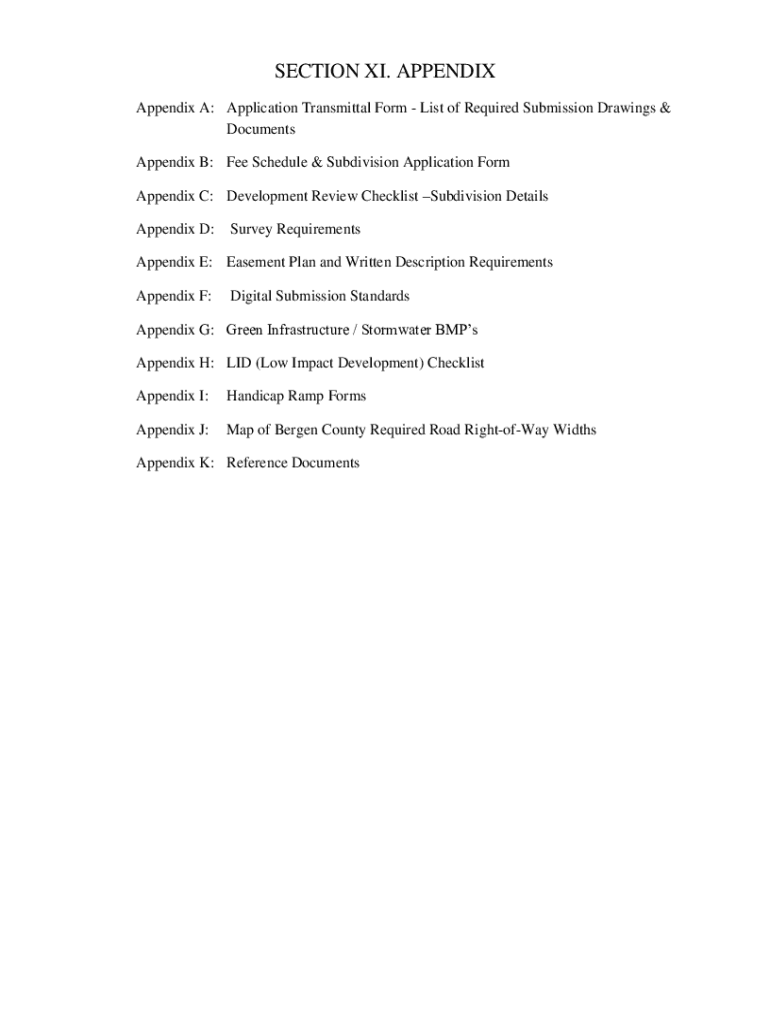 SECTION XI. APPENDIX A: Application Transmittal Form List of Required Submission Drawings & Documents Appendix B: Fee Schedule & Subdivision Application Form Appendix C: Development Review Checklist