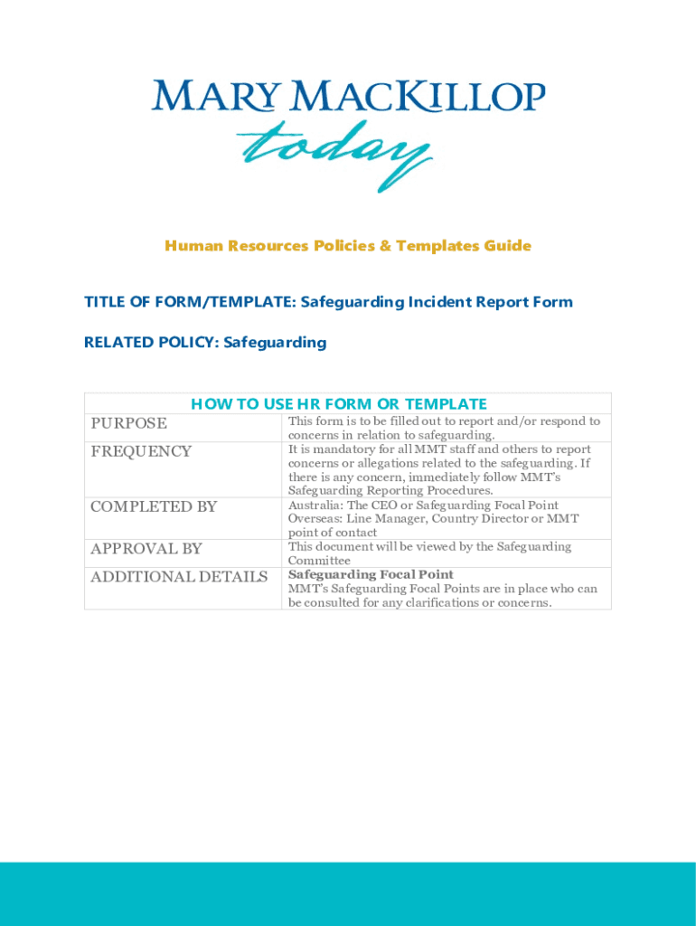 TITLE OF FORM/TEMPLATE: Safeguarding Incident Report Form