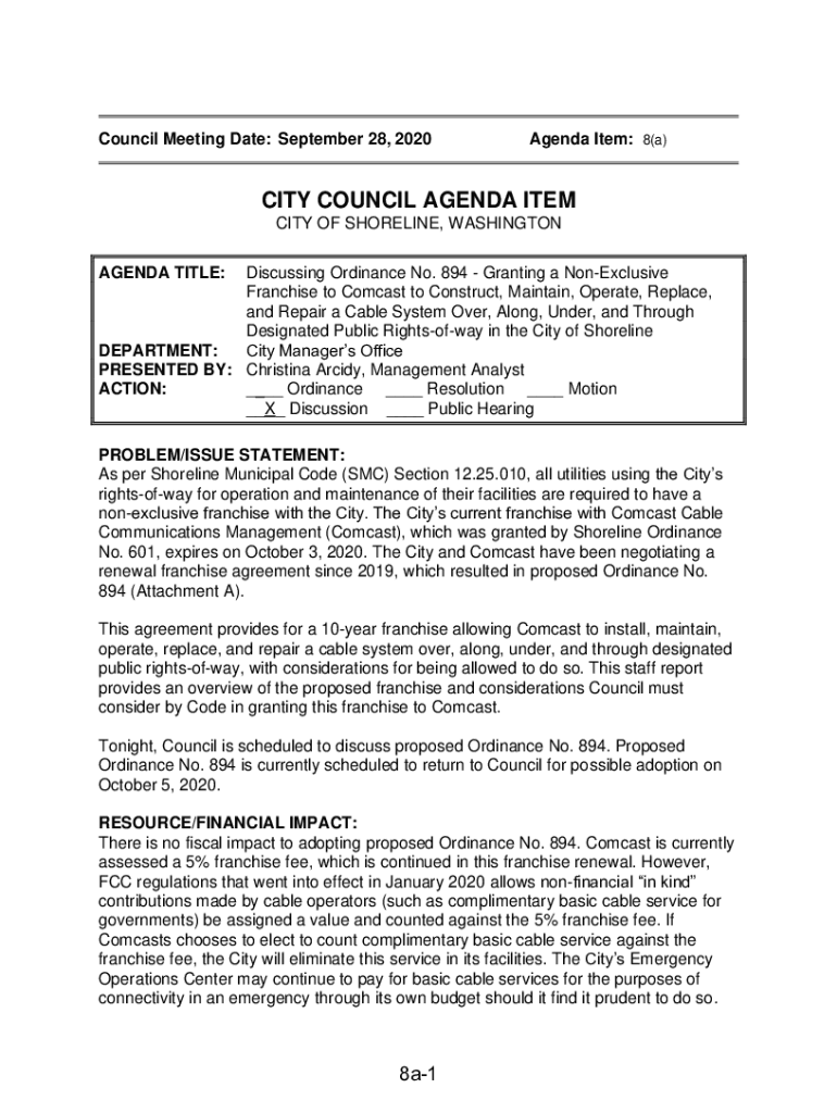 Council Meeting Date: September 28, 2020Agenda Item: 8(a)CITY COUNCIL AGENDA ITEM CITY OF SHORELINE, WASHINGTON AGENDA TITLE:Discussing Ordinance No. 894 Granting a Nonexclusive Franchise to Comcast