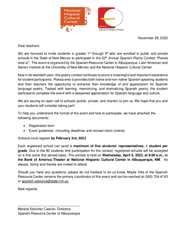 November 28, 2022, Dear teachers: We are honored to invite students in grades 1st through 5th who are enrolled in public and private schools in the State of New Mexico to participate in the 22nd Annual