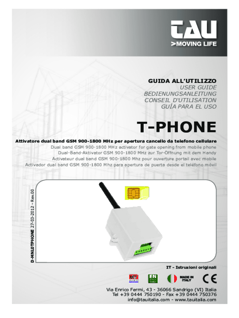 GUIDE ALLUTILIZZO USER GUIDE BEDIENUNGSANLEITUNG CONSENT UTILIZATION GUA PARA EL USOTPHONEDMNL0TPHONE 27032012 Rev.00Attivatore dual-band GSM 9001800 MHz per aperture can cello the telephone cellular