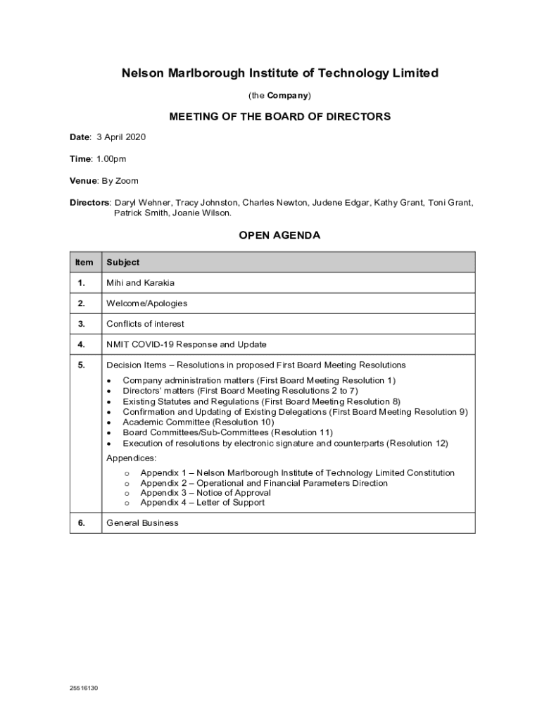 Nelson Marlborough Institute of Technology Limited (the Company)MEETING OF THE BOARD OF DIRECTORS Date: 3 April 2020 Time: 1.00pm Venue: By Zoom Directors: Daryl Werner, Tracy Johnston, Charles Newton,