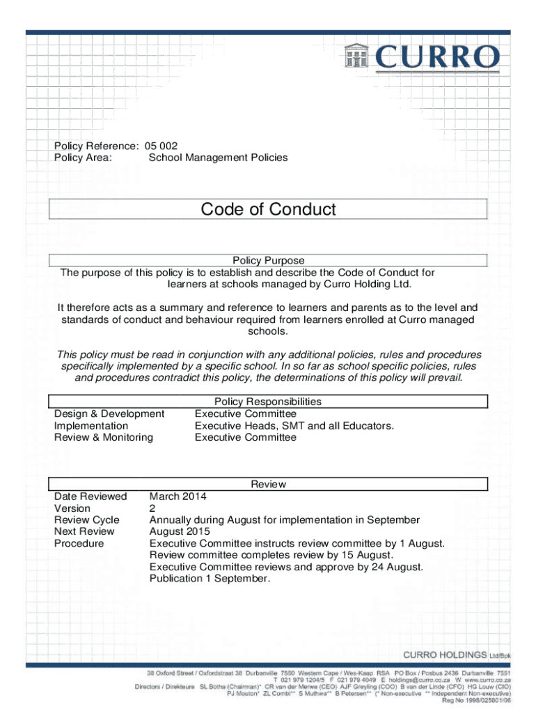 Policy Reference: 05 002 Policy Area: School Management PoliciesCode of Conduct Policy Purpose The purpose of this policy is to establish and describe the Code of Conduct for learners at schools managed