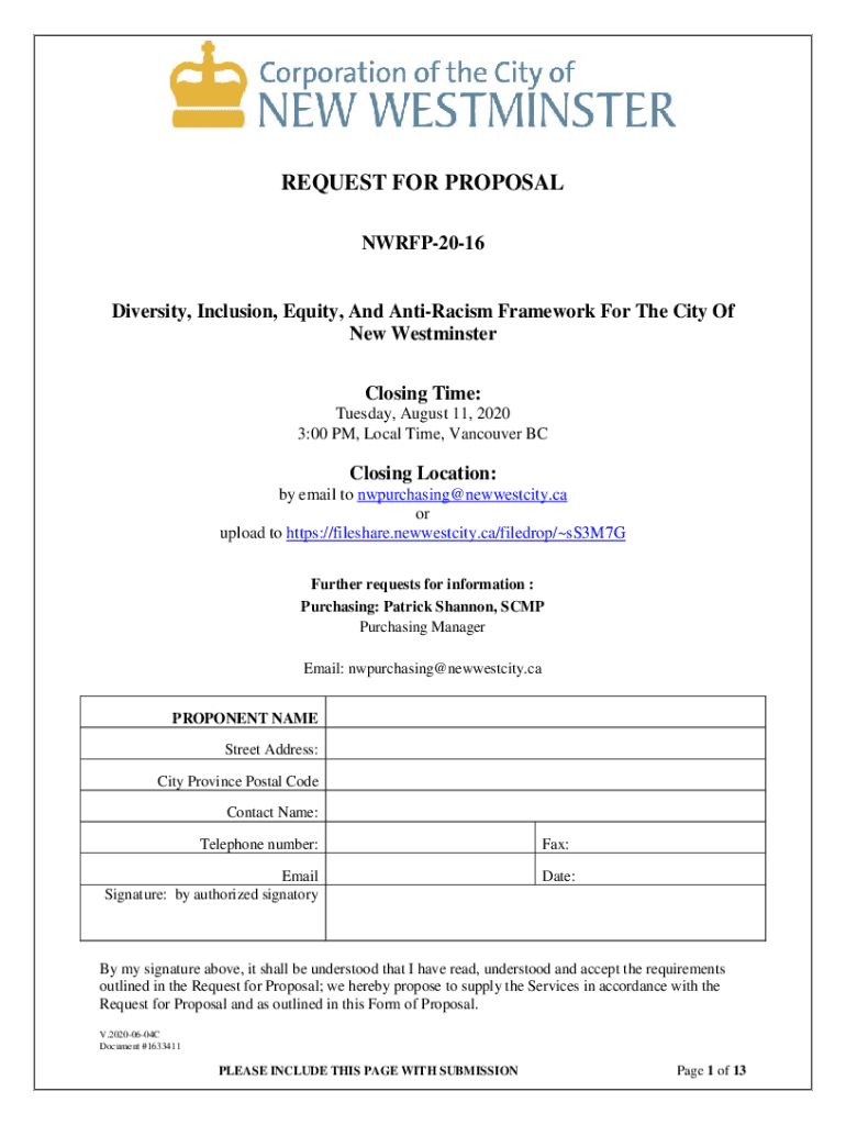 REQUEST FOR PROPOSAL NWRFP2016Diversity, Inclusion, Equity, And AntiRacism Framework For The City Of New Westminster Closing Time: Tuesday, August 11, 2020 3:00 PM, Local Time, Vancouver BCC losing