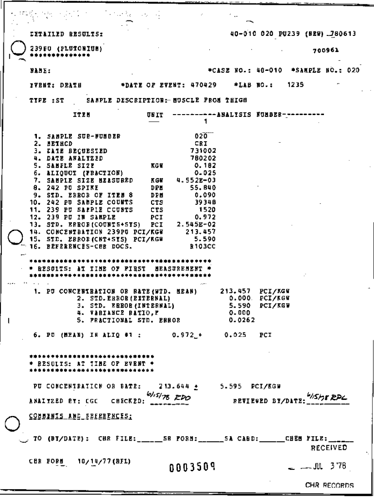 40010 020 PU239 (NEW) _]80613DETAILED RESULTS:O239FU (PLUTONIUM). **************700961 *CASE NO.:. 40010NAME:*DATE OP EVENT: 470429EVENT: DEATH TYPE :ST×LAB NO.:*SAMPLE NO.: 020 1235SAMPLE DESCRIPTION: