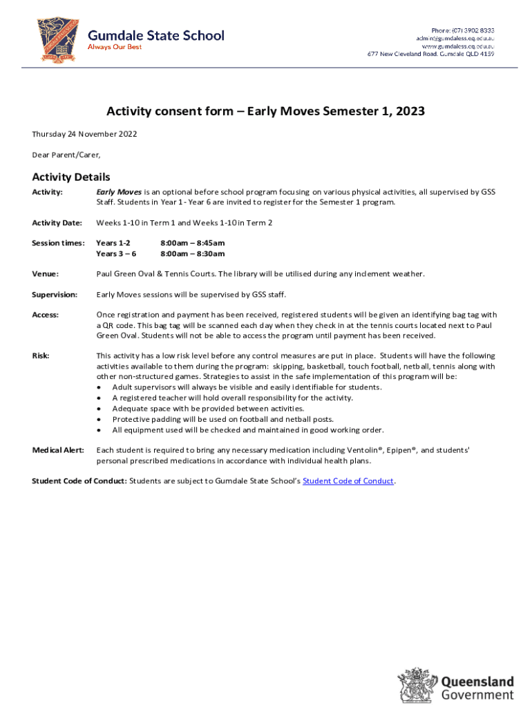 Activity consent form Early Moves Semester 1, 2023 Thursday 24 November 2023 Dear Parent/Carer, Activity Details Activity:Early Moves is an optional before school program focusing on various physical