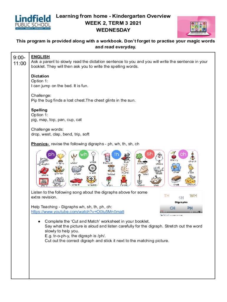 Learning from home Kindergarten Overview WEEK 2, TERM 3 2021 WEDNESDAY This program is provided along with a workbook. Don't forget to practice your magic words and read every day.9:0011:00ENGLISH