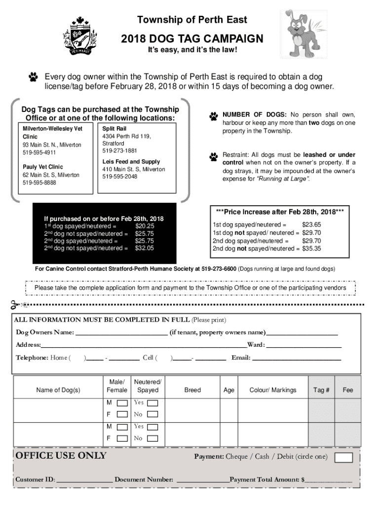 Township of Perth East2018 DOG TAG CAMPAIGN It\'s easy, and it\'s the law! Every dog owner within the Township of Perth East is required to obtain a dog license/tag before February 28, 2018, or within