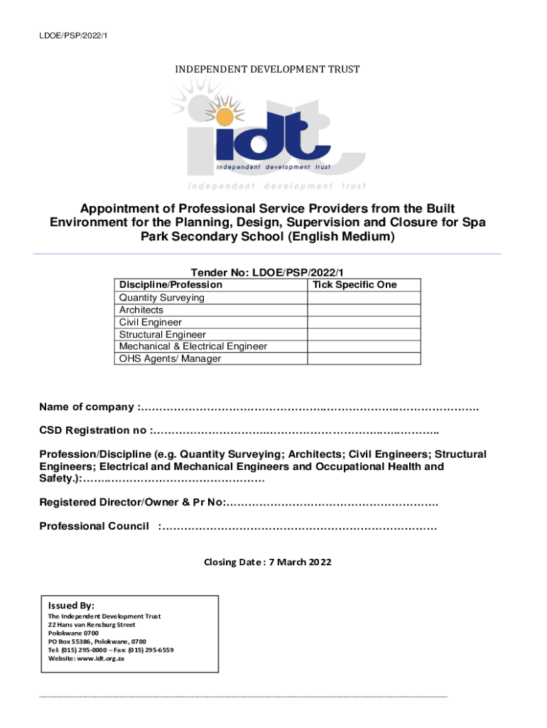 DOE/PSP/2022/1INDEPENDENT DEVELOPMENT TRUSTAppointment of Professional Service Providers from the Built Environment for the Planning, Design, Supervision and Closure for Spa Park Secondary School