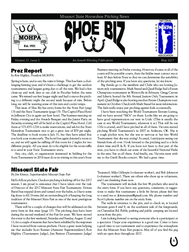 Missouri State Horseshoe Pitching News National h o r s e s h o EP i t c h e r s AssociationVolume 21, Issue 2An AwardWinning PublicationPrez Report by Ron Highly, President MO HPA Spring is here,