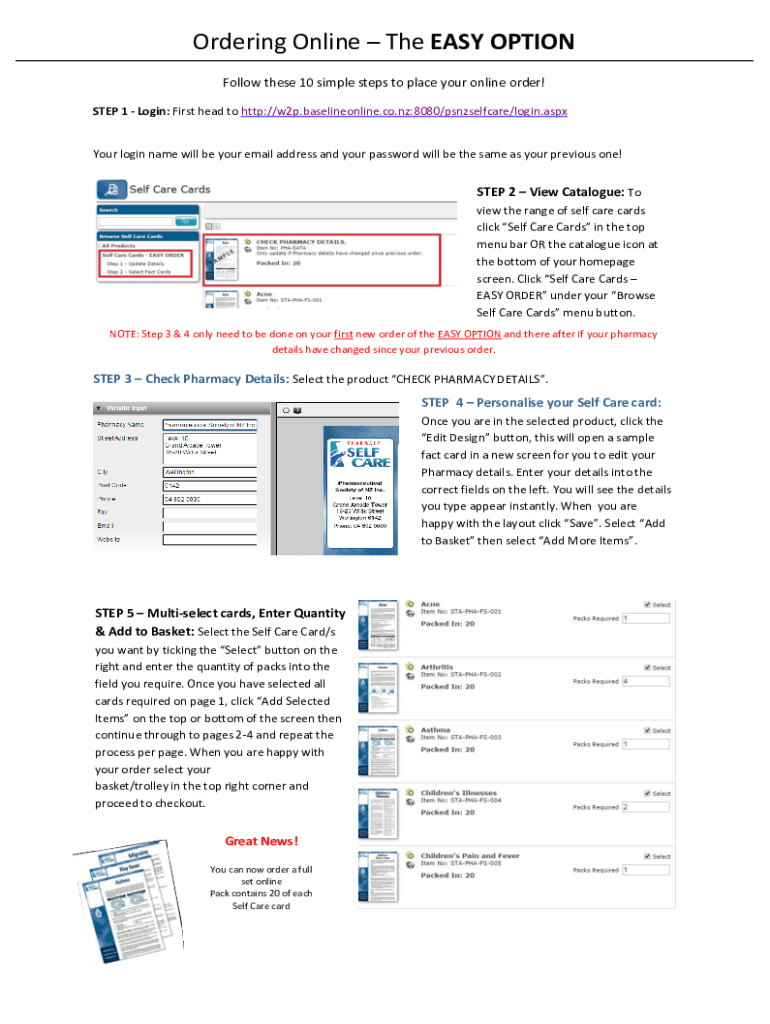 Ordering Online The EASY OPTION Follow these 10 simple steps to place your online order! STEP 1 Login: First head to http://w2p.baselineonline.co.nz:8080/psnzselfcare/login.aspxYour login name will