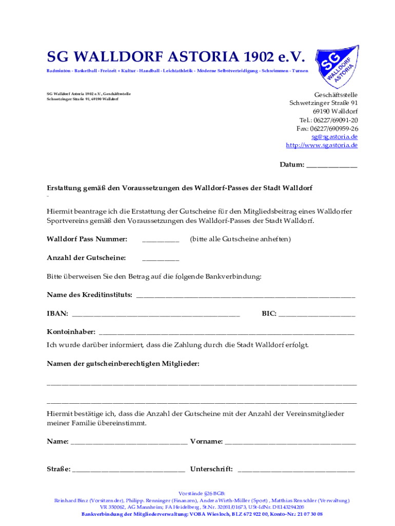 SG WALLDORF ASTORIA 1902 e.V. Badminton Basketball Frazier + Culture Handball Leichtathletik Modern Selbstverteidigung Swimmer TurnenGeschftsstelle Schlesinger Straw 91 69190 Walldorf Tel.: 06227/6909120