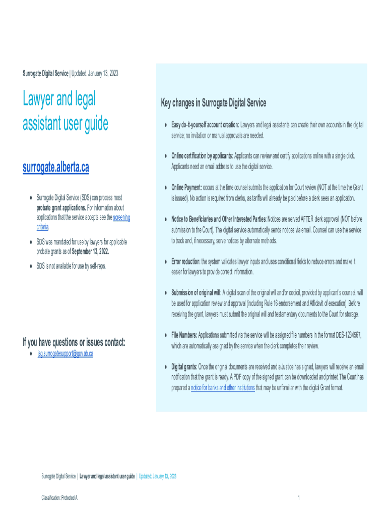 Surrogate Digital Service | Updated: January 13, 2023Lawyer and legal assistant user guide surrogate.Alberta.ca Surrogate Digital Service (SDS) can process most probate grant applications. For information