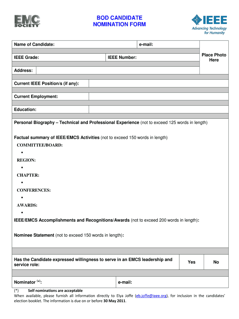 BOD CANDIDATE NOMINATION Forename of Candidate: IEEE Grade:email: Place Photo Here IEEE Number:Address: Current IEEE Position/s (if any): Current Employment: Education: Personal Biography Technical