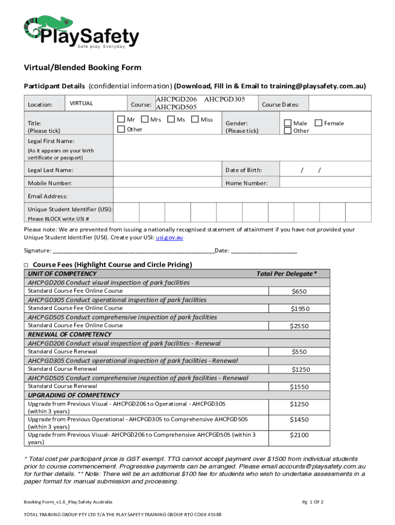 Virtual/Blended Booking Form Participant Details (confidential information) (Download, Fill in & Email to training@playsafety.com.au) Location:Virtualities: (Please tick)AHCPGD206 AHCPGD305Course: