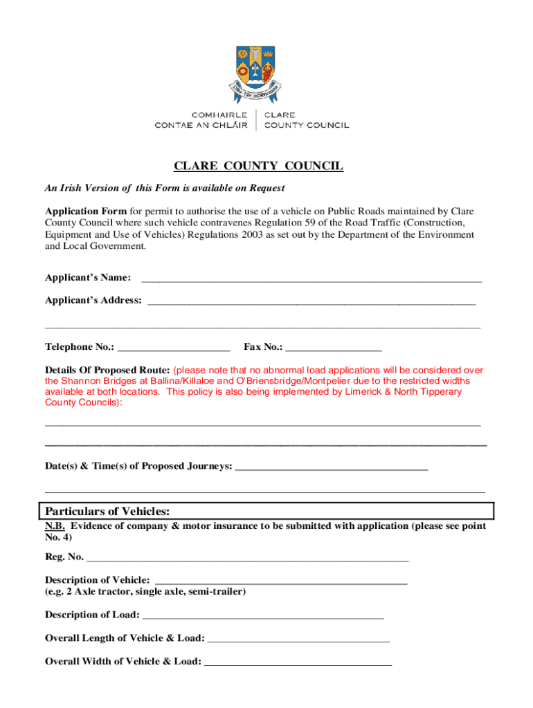CLARE COUNTY COUNCIL An Irish Version of this Form is available on Request Application Form for permit to authorize the use of a vehicle on Public Roads maintained by Clare County Council where such