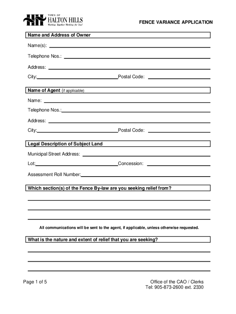 FENCE VARIANCE APPLICATION Name and Address of Owner Name(s): Telephone Nos.: Address: City:Postal Code:Name of Agent (if applicable) Name: Telephone Nos.: Address: City:Postal Code:Legal Description