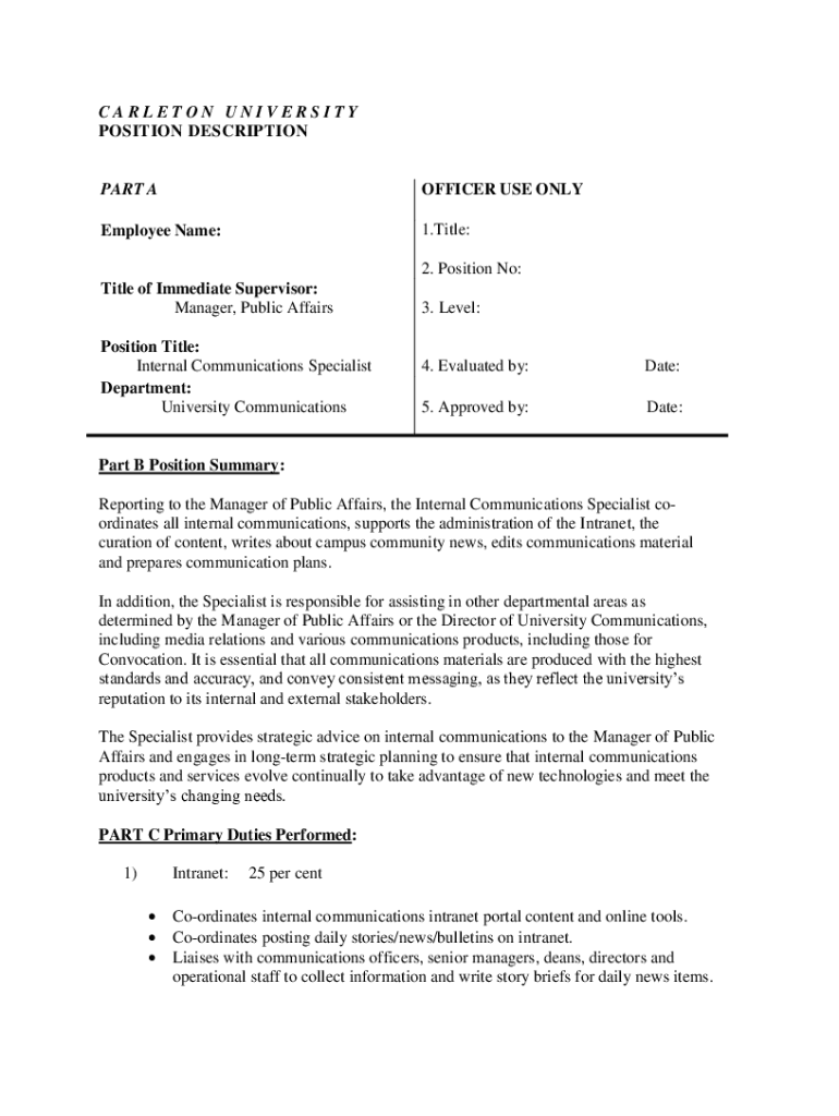 CARLETON UNIVERSITY POSITION DESCRIPTIONPART OFFICER USE ONLYEmployee Name:1. Title: 2. Position No:Title of Immediate Supervisor: Manager, Public Affairs Position Title: Internal Communications Specialist