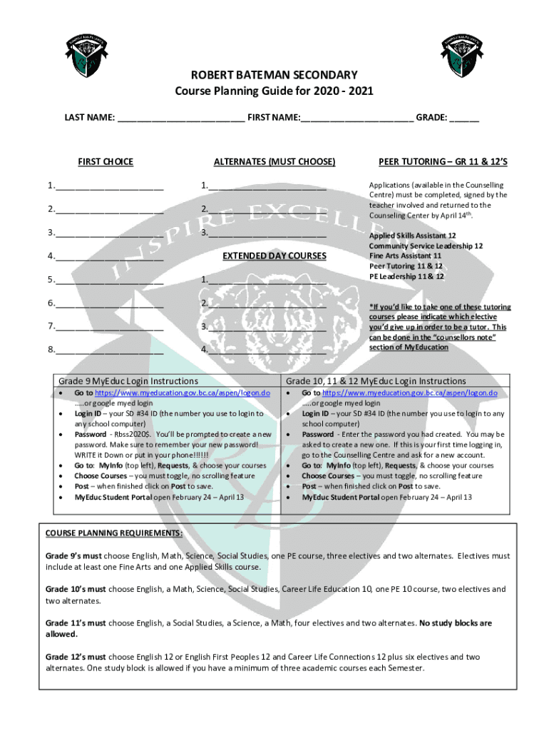 ROBERT BATSMAN SECONDARY Course Planning Guide for 2020 2021 LAST NAME: ___ FIRST NAME:___ GRADE: ___FIRST CHOICEALTERNATES (MUST CHOOSE)1.___1.___2.___2.___3.___3.___4.___EXTENDED DAY COURSES5.___1.___6.___2.___7.___3.___8.___4.___PEER