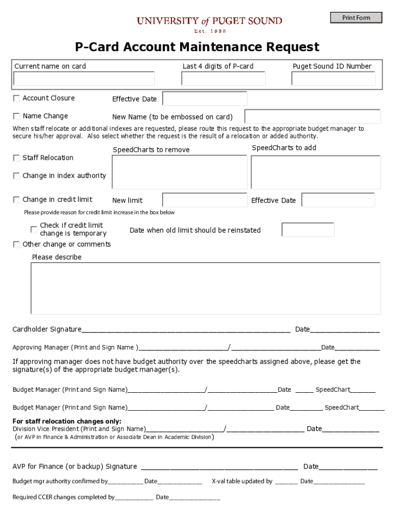 Print Forward Account Maintenance Request Current name on cards 4 digits of PcardAccount ClosureEffective Database Change Name (to be embossed on card)Puget Sound ID Numbered staff relocate or additional