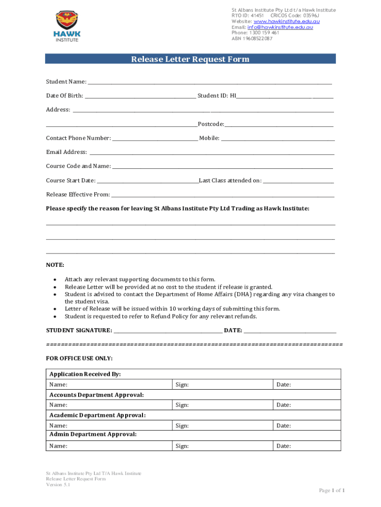 St Albany Institute Pty Ltd t/a Hawk Institute RTO ID: 41451 CRICKS Code: 03596J Website: www.hawkinstitute.edu.au Email: info@hawkinstitute.edu.au Phone: 1300 159 461 ABN 19608522087Release Letter