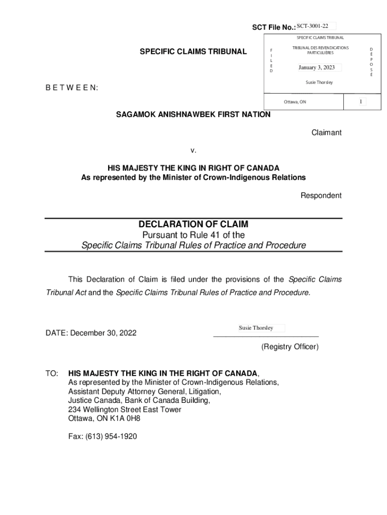 SET File No.: SCT300122 SPECIFIC CLAIMS TRIBUNALSPECIFIC CLAIMS TRIBUNAL I L E DTRIBUNAL DES REDEDICATIONS PARTICULIRESJanuary 3, 2023 Susie Thursday E T W E E N: Ottawa, ON1SAGAMOK ANISHINAABE FIRST