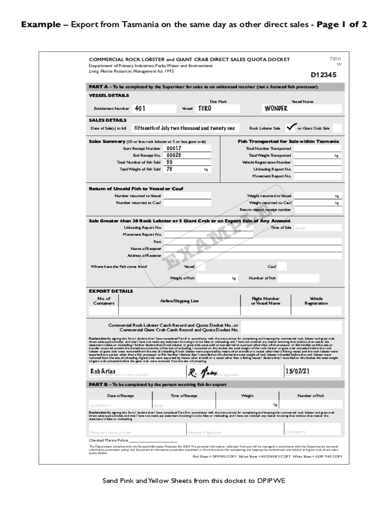 Example Export from Tasmania on the same day as other direct sales Page 1 of 2F3021 COMMERCIAL ROCK LOBSTER and GIANT CRAB DIRECT SALES QUOTA DOCKET Department of Primary Industries, Parks, Water