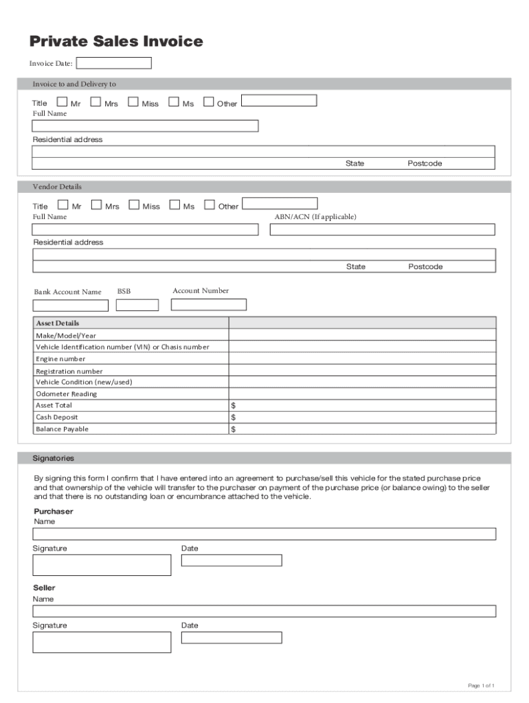 Private Sales Invoice Date: Invoice to and Delivery to Title Mr Full NameMrsMissMsOtherResidential address StatePostcodeVendor Details Title Mr Full NameMrsMissMsOther ABN/ACN (If applicable)Residential