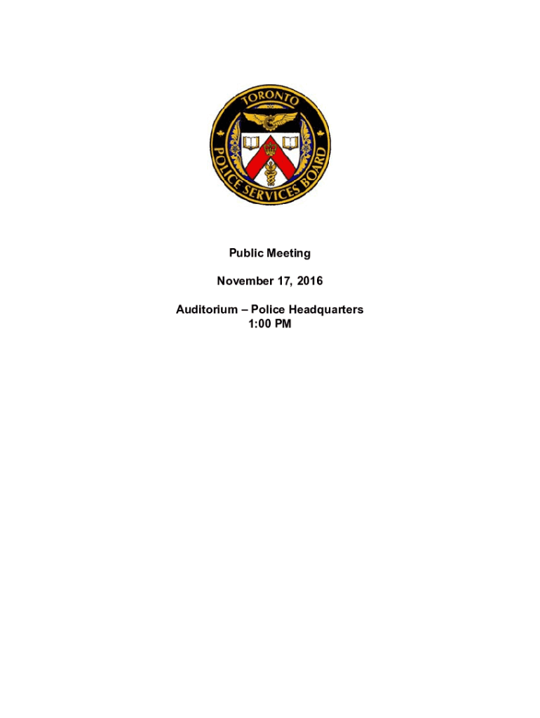 Public Meeting November 17, 2016, Auditorium Police Headquarters 1:00 Public Meeting Agenda Auditorium Thursday, 40 College Street, 2nd Floor November 17, 2016, Toronto, Ontario at 1:00 PM www.tpsb.ca