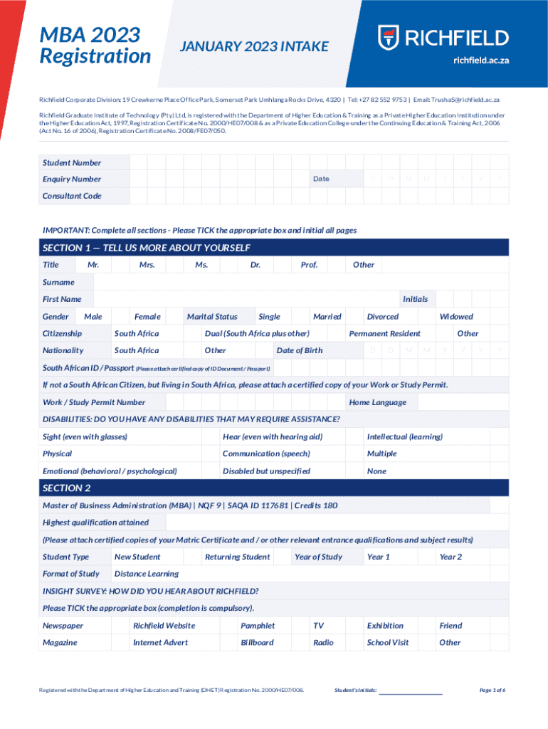 MBA 2023 RegistrationJANUARY 2023 INTAKERichfield Corporate Division: 19 Cruiser Place Office Park, Somerset Park Mélange Rocks Drive, 4320 | Tel: +27 82 552 9753 | Email: TrushaS@richfield.ac.za