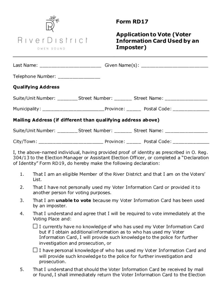Form RD17 Application to Vote (Voter Information Card Used by an Imposter) Last Name: ___ Given Name(s): ___ Telephone Number: ___ Qualifying Address Suite/Unit Number: ___ Street Number: ___ Street