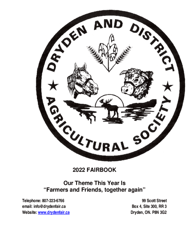 2022 FACEBOOK Our Theme This Year Is Farmers and Friends, together again Telephone: 8072236766 email: info@drydenfair.ca Website: www.drydenfair.ca99 Scott Street Box 4, Site 300, RR 3 Dryden, ON.