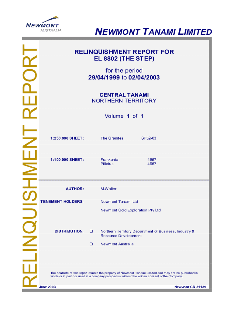 NEWMAN TATAMI LIMITED RELINQUISHMENT REPORT FOR EL 8802 (THE STEP) for the period 29/04/1999 to 02/04/2003 CENTRAL TATAMI NORTHERN TERRITORY Volume 1 of 11:250,000 SHEET:The Granites1:100,000 SHEET:Franconia