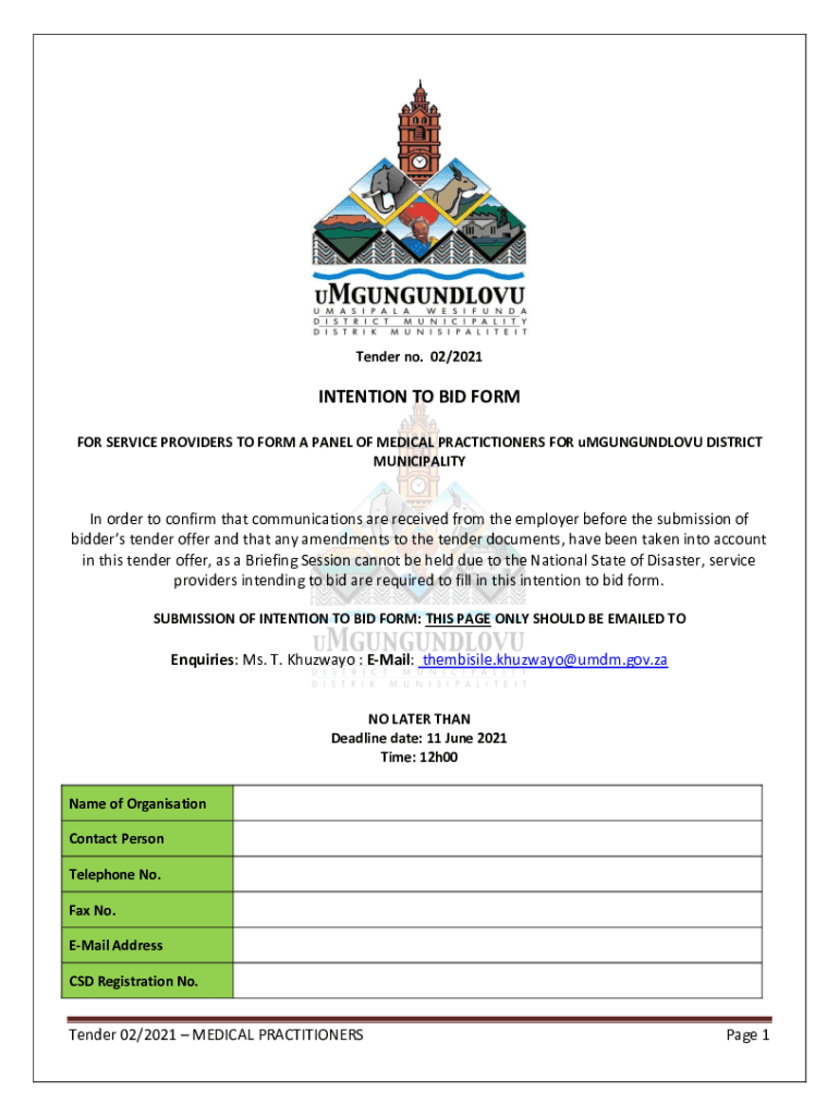 Tender no. 02/2021INTENTION TO BID FORM FOR SERVICE PROVIDERS TO FORM A PANEL OF MEDICAL PRACTITIONERS FOR uMGUNGUNDLOVU DISTRICT MUNICIPALITY In order to confirm that communications are received