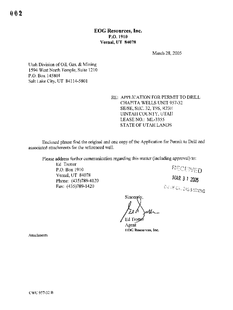 002 EOG Resources, Inc. P.O. 1910 Vernal, UT 84078 March 28, 2005, Utah Division of Oil, Gas, & Mining 1594 West North Temple, Suite 1210 P.O. Box 145801 Salt Lake City, UT 841145801RE: APPLICATION