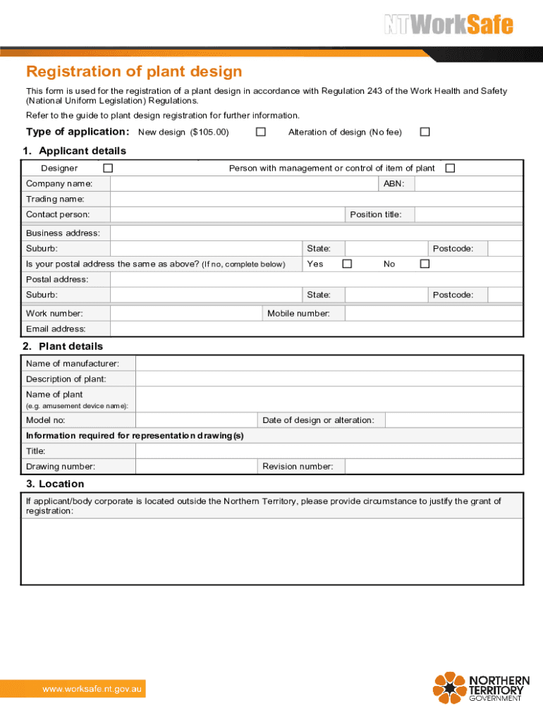 Registration of plant design This form is used for the registration of a plant design in accordance with Regulation 243 of the Work Health and Safety (National Uniform Legislation) Regulations. Refer