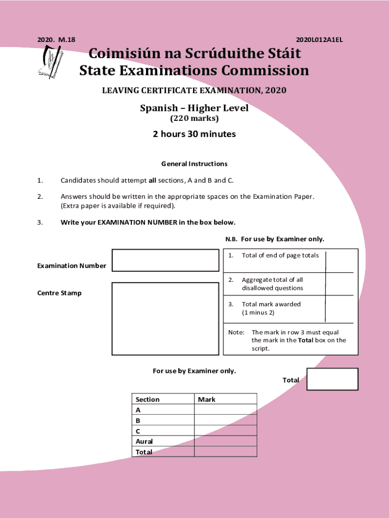 2020. M.182020L012A1ELCoimisin Na Scrduithe Suit State Examinations Commission LEAVING CERTIFICATE EXAMINATION, 2020Spanish Higher Level (220 marks)2 hours 30 minutes General Instructions 1. Candidates