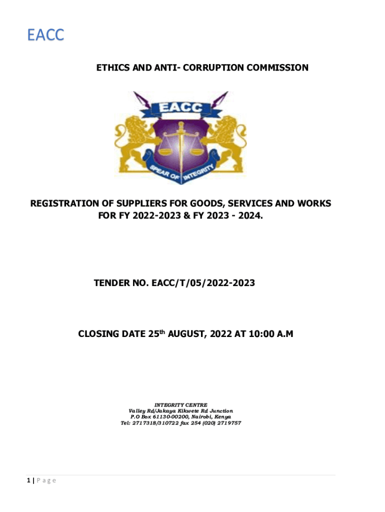 FOR FY 20222023 & FY 2023 2024.TENDER NO. EACH/T/05/20222023CLOSING DATE 25th AUGUST 2022 AT 10:00