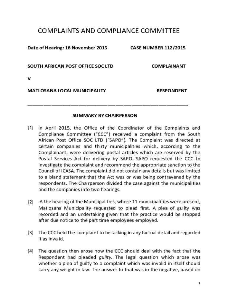 COMPLAINTS AND COMPLIANCE COMMITTEE Date of Hearing: 16 November 2015CASE NUMBER 112/2015SOUTH AFRICAN POST OFFICE SOC LTDCOMPLAINANTV MAULANA LOCAL MUNICIPALITYRESPONDENT___ SUMMARY BY CHAIRPERSON
