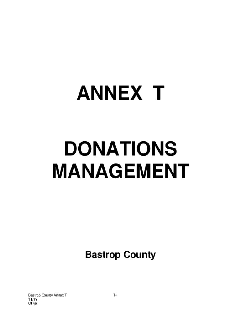 ANNEX T DONATIONS MANAGEMENTBastrop CountyBastrop County Annex T 11/19 CF/jeTiAPPROVAL & IMPLEMENTATIONAnnex T Donations ManagementBastrop County Judge, Paul PapeDateBastrop County EMC, Christine