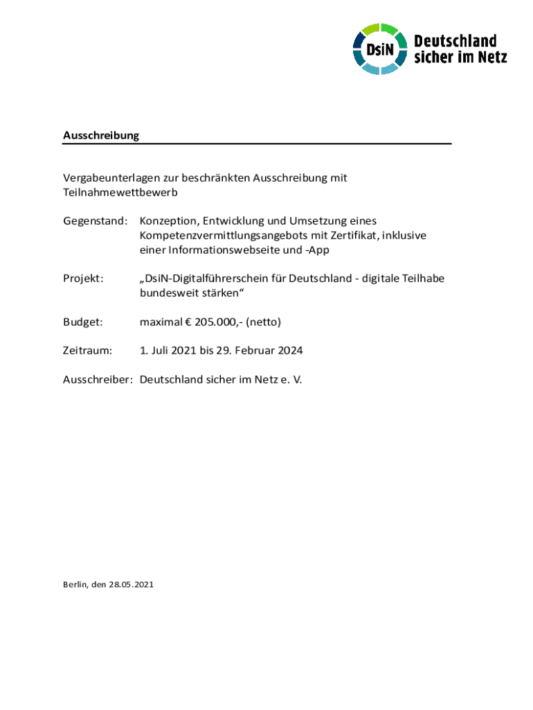 Ausschreibung Vergabeunterlagen our beschrnkten Ausschreibung MIT Teilnahmewettbewerb Gegenstand: Conception, Entwicklung UND Upsetting lines Kompetenzvermittlungsangebots MIT Certificate, inclusive