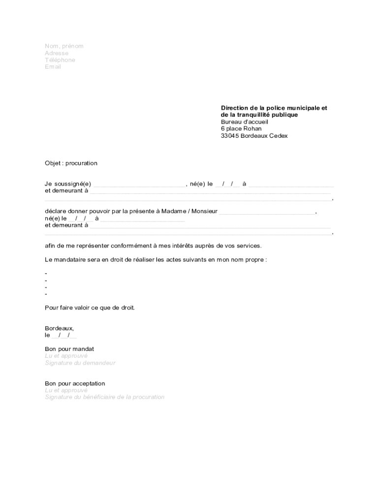Not, prom Address Tl phone Misdirection DE la police municipal et de la tranquil lit oblique Bureau factual 6 place Rohan 33045 Bordeaux CedexObjet : procreation JE sous sign(e) ___, n(e) LE __/__/__