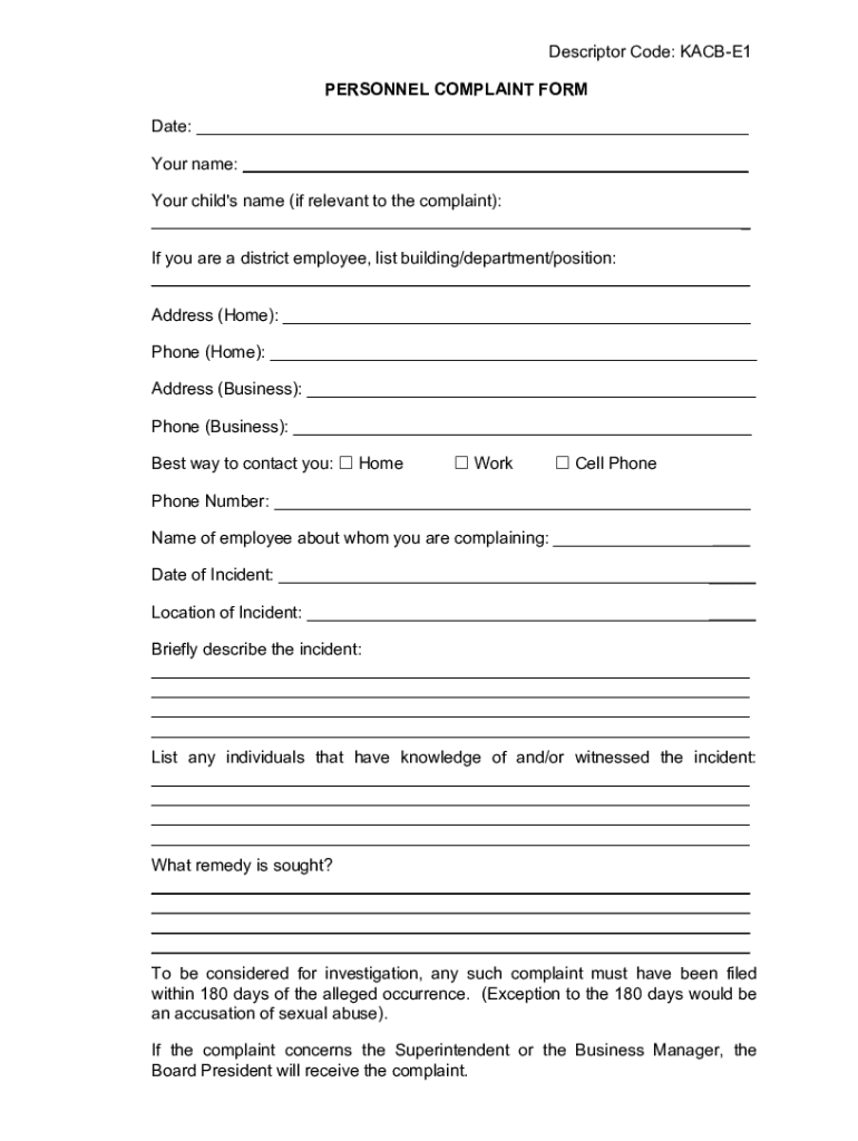 Descriptor Code: KACBE1 PERSONNEL COMPLAINT FORM Date: ___ Your name: ___ Your child\'s name (if relevant to the complaint): ___ If you are a district employee, list building/department/position: